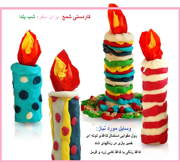 تصویر شعله های آتش را روی کاغذ بکشید و اجازه بدید نوآموز خودش بریده و رنگ آمیزی کند سپس در یک سمت رول مقوایی برشهای 1 سانتی ایجاد کنید و شعله های آتش را که رنگشان خشک شده است در شیارها فرو ببرید و با چسب محکم کنید.