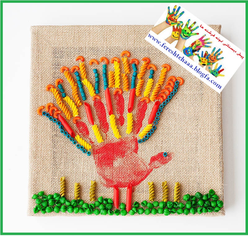 ماکارونی های پیچی رو با مقداری رنگ پودری مثل رنگهای غذایی به رنگهای شاد و براق رنگ کنید و بذارید تا خشک بشن . حالا با کف دست کودک بدن طاووس و با ماکارونی های رنگ شده پر و بالهای زیبای طاووس رو خلق کنید